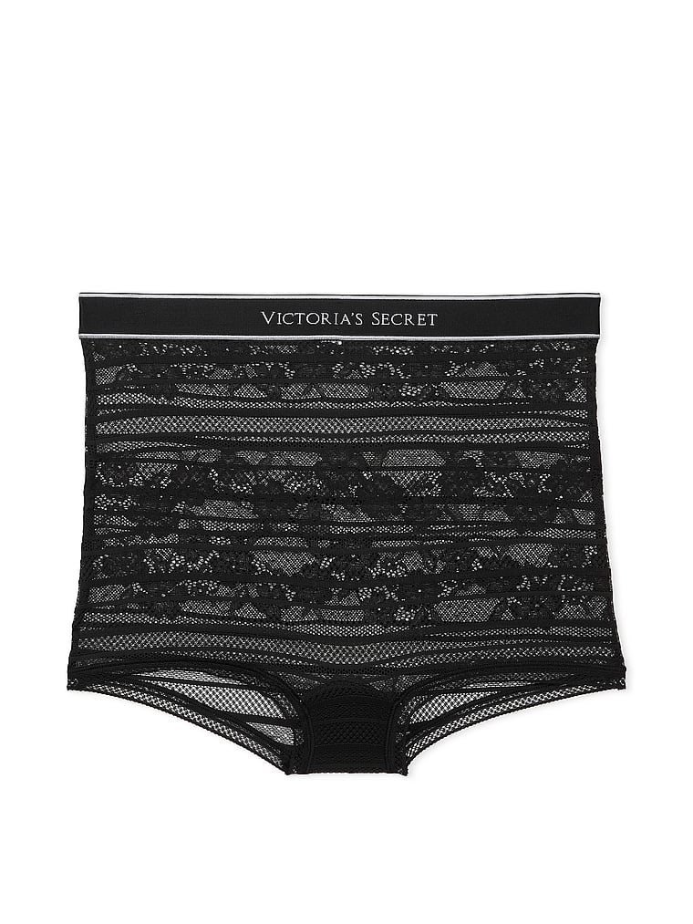 Feminine floral lace is topped off with our signature logo waistband for a new twist on a comfy boyshort.
