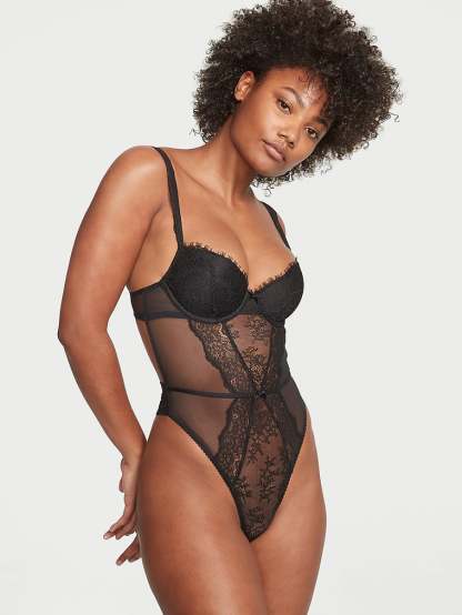 Sheer lace mingles with comfy underwire support on a dreamy one-piece featuring an open back. Perfect as a bodysuit under jeans.