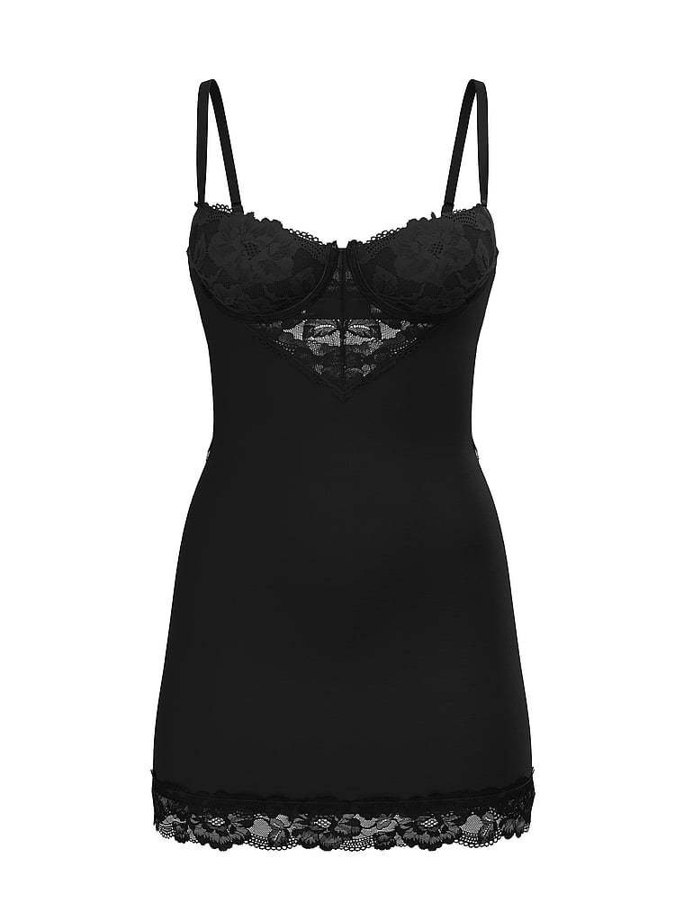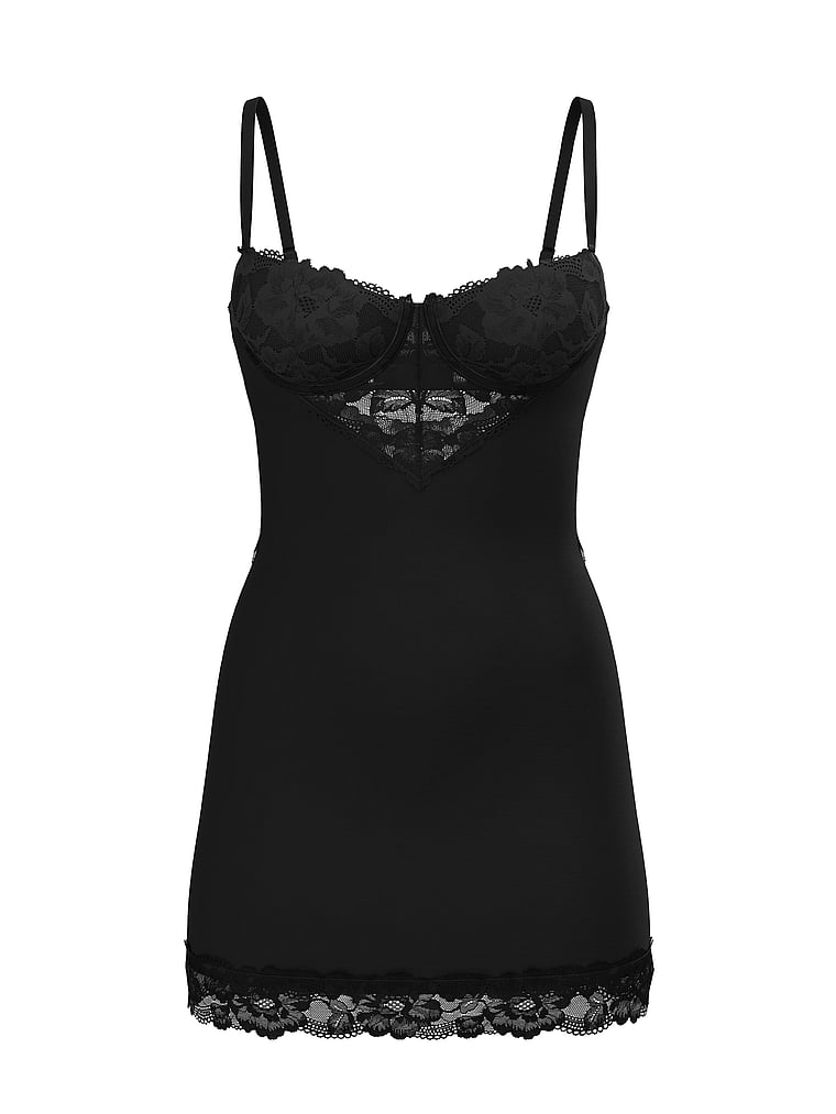 Elevated comfort. This supersoft modal mini boasts delicate lace from front to back, plus at the hem. A cutout in back adds another sexy touch.